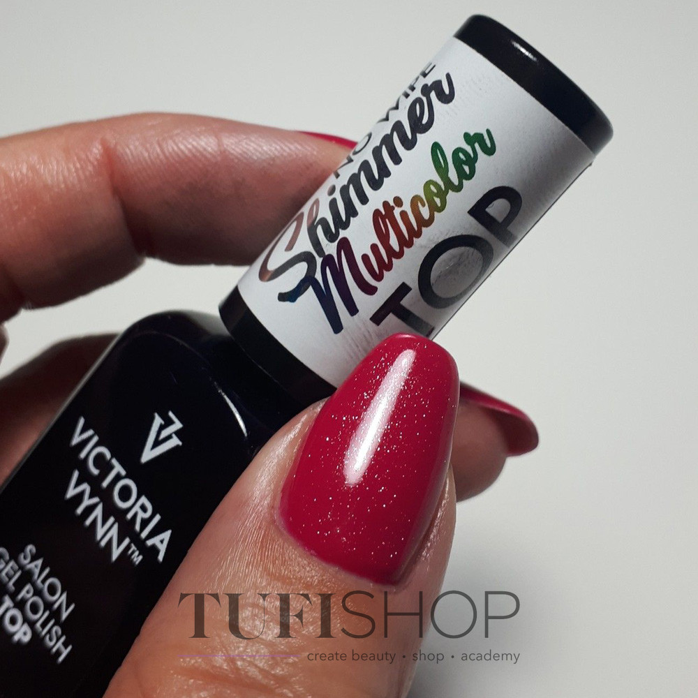 Top is the top coat for applying gel polish. Top Victoria Vynn is easily distributed over the nail plate and covers it evenly. Has a medium consistency. Contains multi-colored microshine, ideal for colored gel polish and jacket, increases the durability of manicure. The top without a sticky layer shortens and facilitates the work of the master. The color of the gel polish is reliably protected by the top, which also prevents chipping and peeling of the gel polish. Not removed with acetone.
