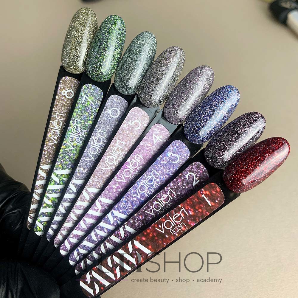 Lakier żelowy Valeri to wysokiej jakości i niedrogi materiał opracowany przez profesjonalistów dla mistrzów branży paznokciowej! Paleta obejmuje wiele różnych kolorów i serii. Kolekcja lakierów żelowych Flash składa się z wysoce napigmentowanych i odpornych na ścieranie kolorów. Lakier żelowy zawiera odblaskowy piasek i brokat, niezwykle błyszczący w każdym świetle. Łatwy w użyciu, wystarczy jedna warstwa, która równomiernie rozprowadza się na płytce paznokcia i nie kapie na boczne wałki. Dzięki bardzo korzystnej i wygodnej pojemności można stworzyć własną, dużą paletę lakierów żelowych. Valeri Flash lakieru hybrydowy gwarantuje stworzenie atrakcyjnego, niepowtarzalnego i perfekcyjnego manicure w świątecznym stylu.